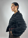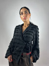 Questa blusa in unico colore nero è realizzata con una lavorazione a balze orizzontali che donano movimento e un effetto tridimensionale ricercato.