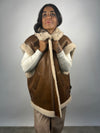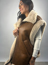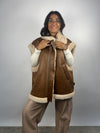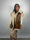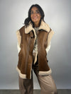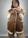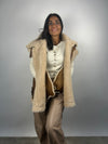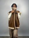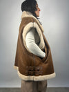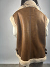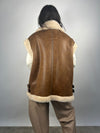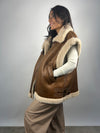 Gilet montone smanicato effetto eco-pelle, dalla linea over e dallo stile deciso. Il modello presenta interno in morbida pelliccia shearling a contrasto, collo alto con fibbia regolabile, chiusura frontale con zip e tasche laterali funzionali. I dettagli con inserti e cinturini laterali aggiungono un tocco grintoso e contemporaneo.