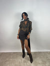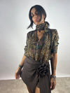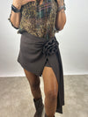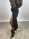 Il dettaglio del mix fiore in tessuto e una Rouge che scende lungo la gamba, partendo dal fiocco, un dettaglio che rende ancora più particolare questo capo .