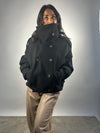 Il modello è arricchito da fasce con cinturino sui polsi e spalline con pattina e bottone, dettagli che richiamano lo stile militare e donano carattere al capo. La chiusura doppiopetto con bottoni completa il look rendendolo pratico ed elegante.