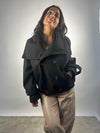 Cappottino corto dal design moderno e femminile, caratterizzato da un ampio collo sciallato che valorizza la linea del viso e dona un tocco sofisticato. Realizzato in tessuto morbido e strutturato, presenta una vestibilità comoda con elastico al girovita, che modella delicatamente la silhouette.