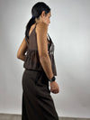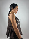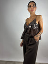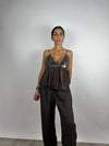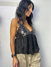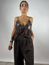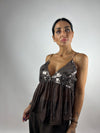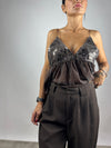 Questo top presenta scollo a V profondo, spalline sottili e un bustino impreziosito da paillettes e ricami che donano luce e carattere al look.