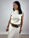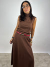 La maglia smanicate in lana e viscosa con mezzo collo si abbina perfettamente alla gonna dalla linea pulita, leggermente svasata, Creando un look armonico, Femminile e versatile.