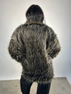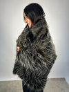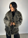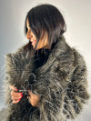 Realizzata in eco-pelliccia di alta qualità, unisce morbidezza e leggerezza con un effetto visivo unico: il tessuto presenta una trama mélange nei toni del muschio e del ghiaccio, arricchita da finiture lucenti e filamenti sottili che catturano la luce ad ogni movimento.
